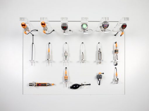 Overview board for pressure and temperature sensors. Measurement values can be accessed via moneo. Selected pressure sensors can generate measurement values using a hand pump. No external compressed air needed.